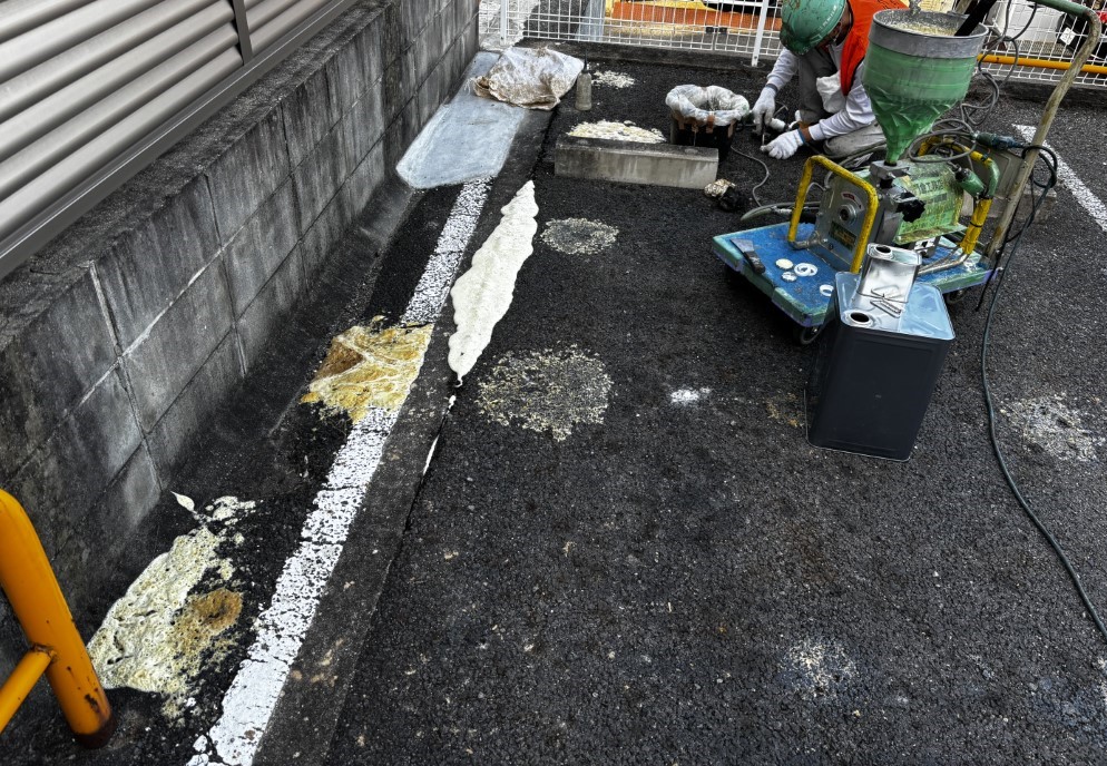 一部で陥没が発生した愛知県の工場所有の駐車場にて路面下の補強工事をさせていただきました。ブロック塀の向こう側の隣地の造成工事のあとからアスファルトの沈下が始まり、先日境目大きな陥没が発生したため、安全の為使用を中止した現場です。調査により空洞化と周辺土壌の軟弱化が確認されたので、すぐに補強工事を実施しました。陥没箇所は事前に埋め戻しを実施しておいていただきました。アスファルトの種類にもよりますが、水たまり防止の浸水性の高いアスファルトは目地が荒い為、特に注入孔付近では反応した材料が下から浮かび上がってきます。その為どうしても施工後に樹脂跡が残ってしまうのはご了承いただいております。