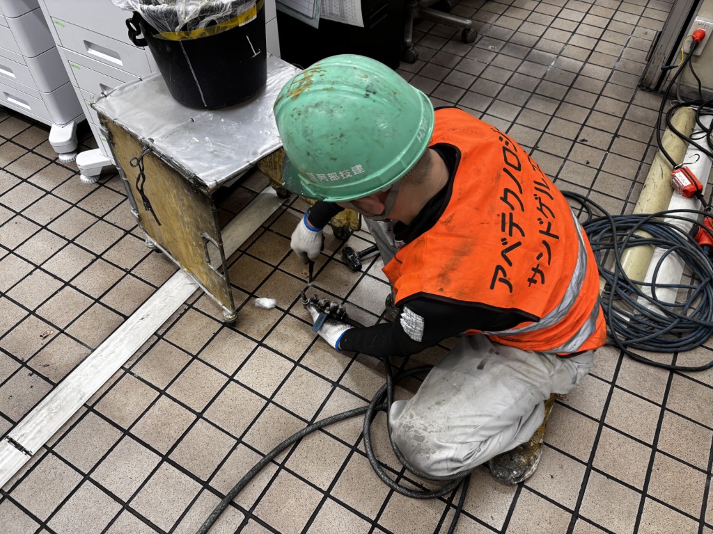 先週末は大阪府の工場にて、工場事務所を工事させていただきました。タイル張りの床ですが、目地のクロス部分に注入孔をあけ、タイルにダメージが及ばないように施工しました。塗床、シート張りなど色々な現場で施工していますので、まずは何でもご相談下さい。
