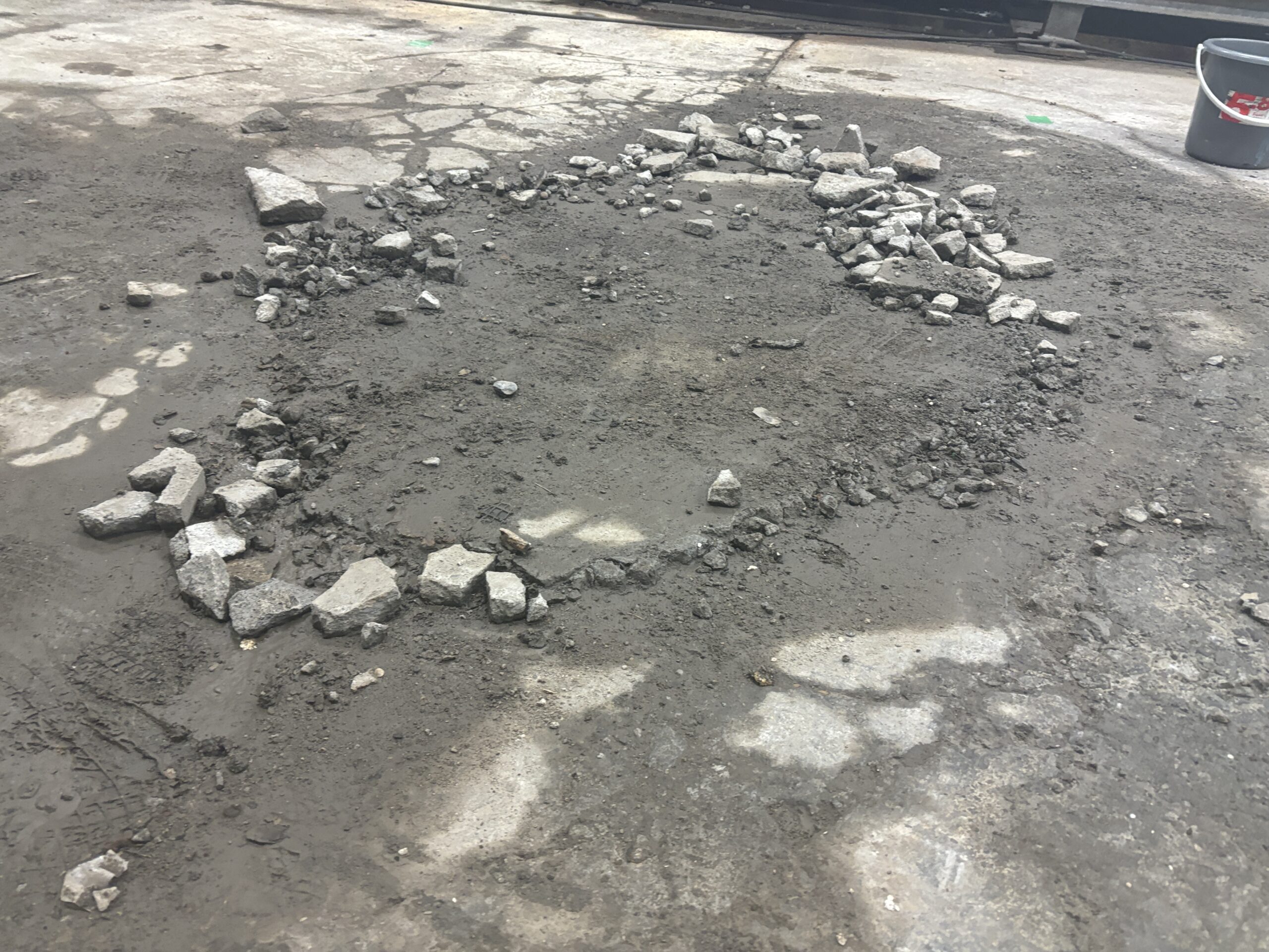そしてその鉄板をどけるとコンクリート床がボロボロ。