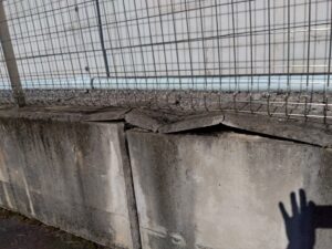 写真は建屋外の擁壁ですが、擁壁を押し出すほどの建屋の荷重が擁壁側に集中しているのがわかります。