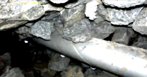 埋設配管の多くは写真のような塩ビ管が入っている事が多いので、塩ビ管がたわみ、割れることで排水漏れが発生致します。