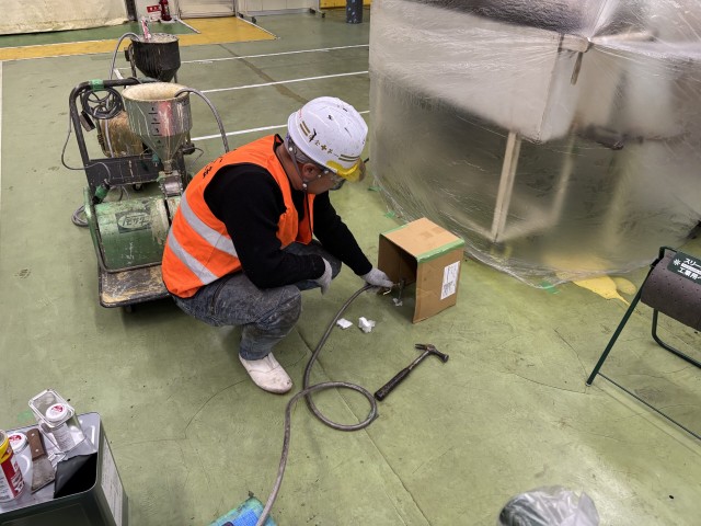 特殊樹脂注入完了後、床に開けた穴を補修します。
