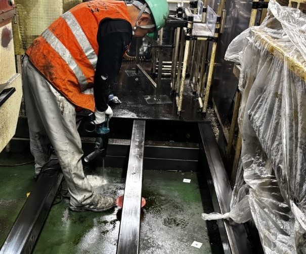 マシニング加工機周辺を万遍なく対策するため、中央の足場も撤去し注入孔を削孔。
