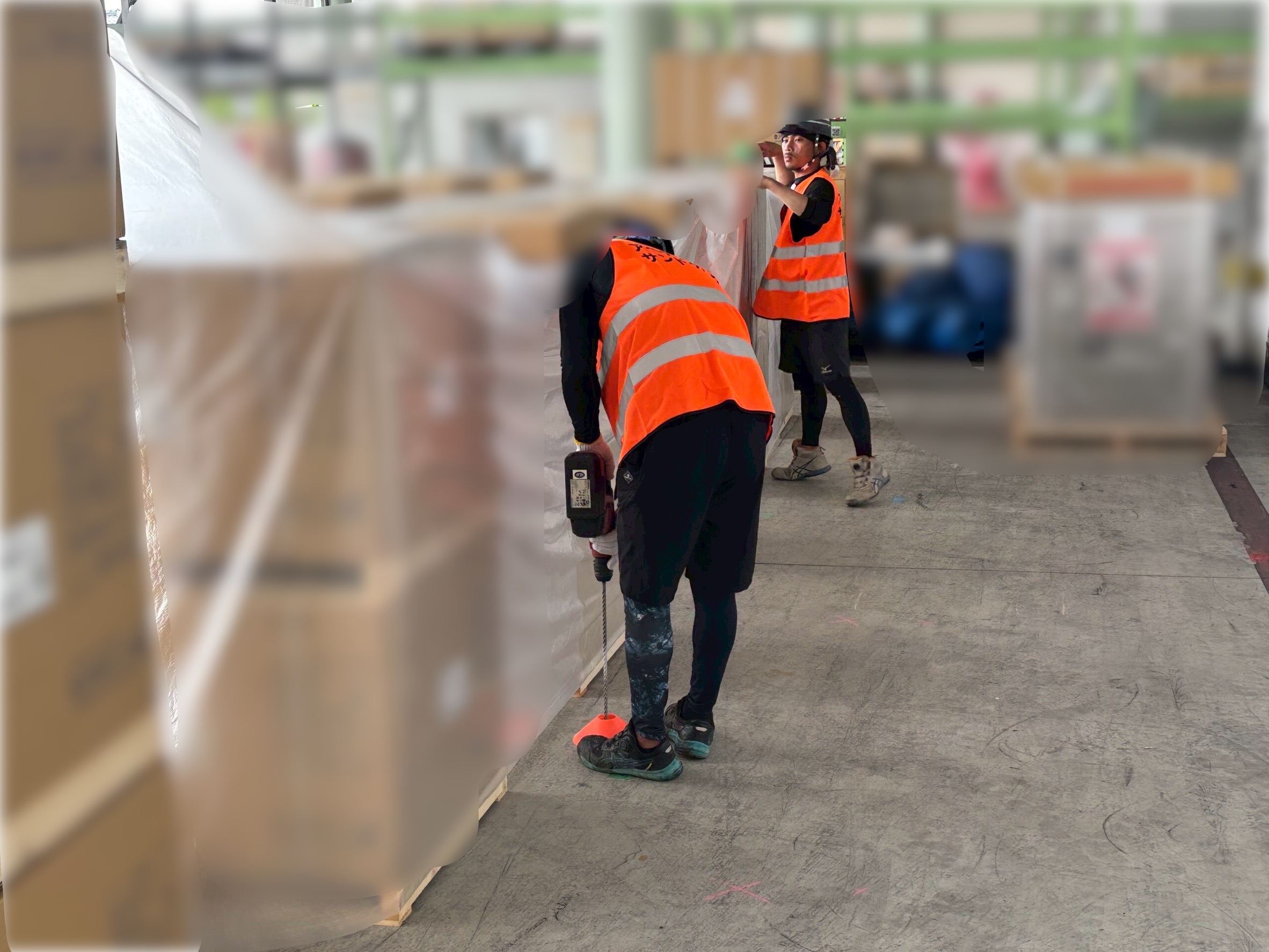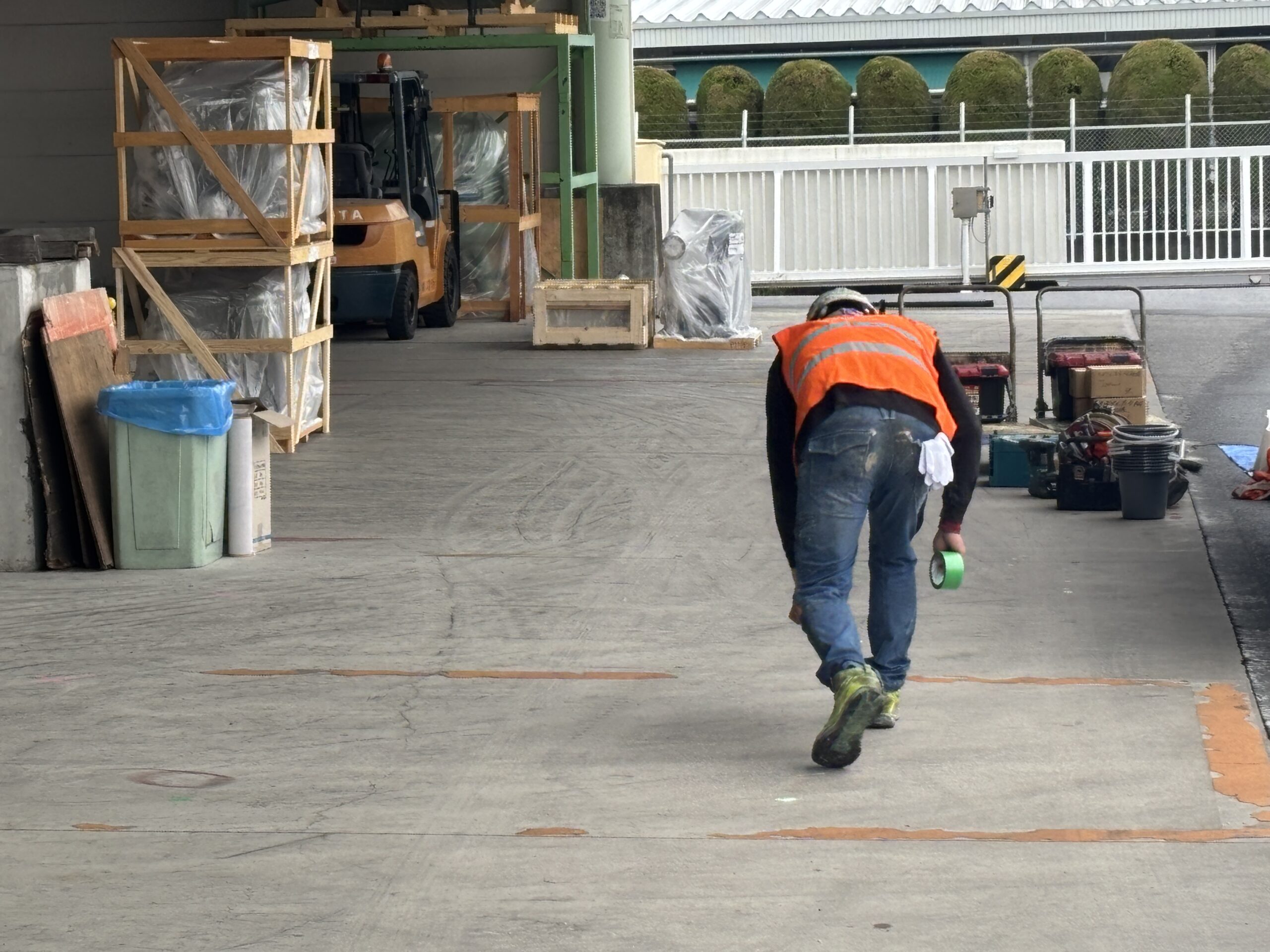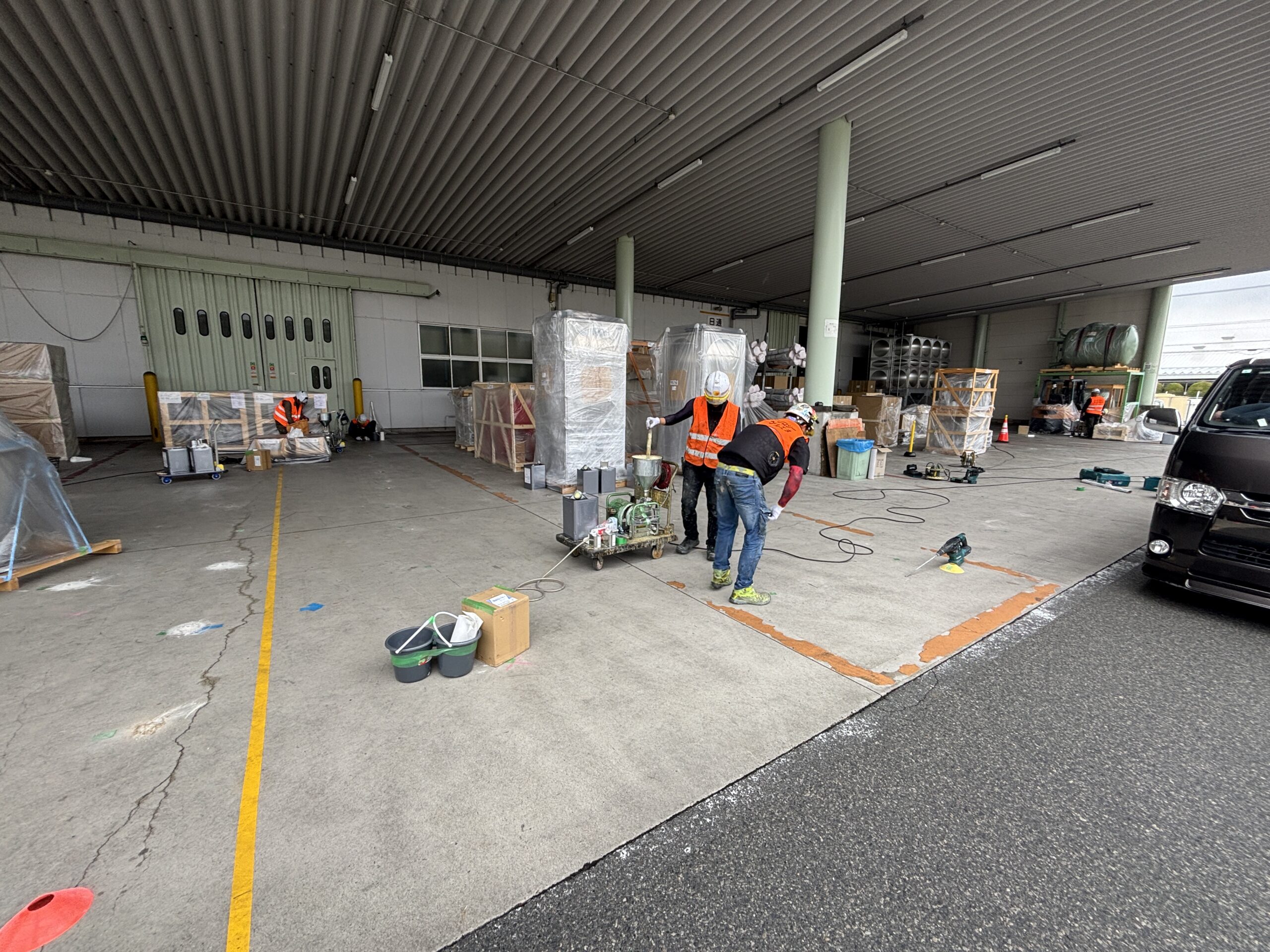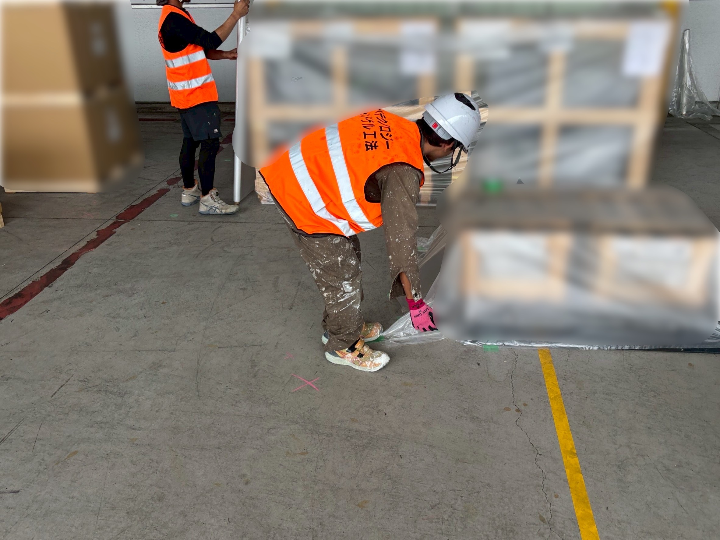 製品や設備に影響が及ばないようにビニールシートで養生を行います。