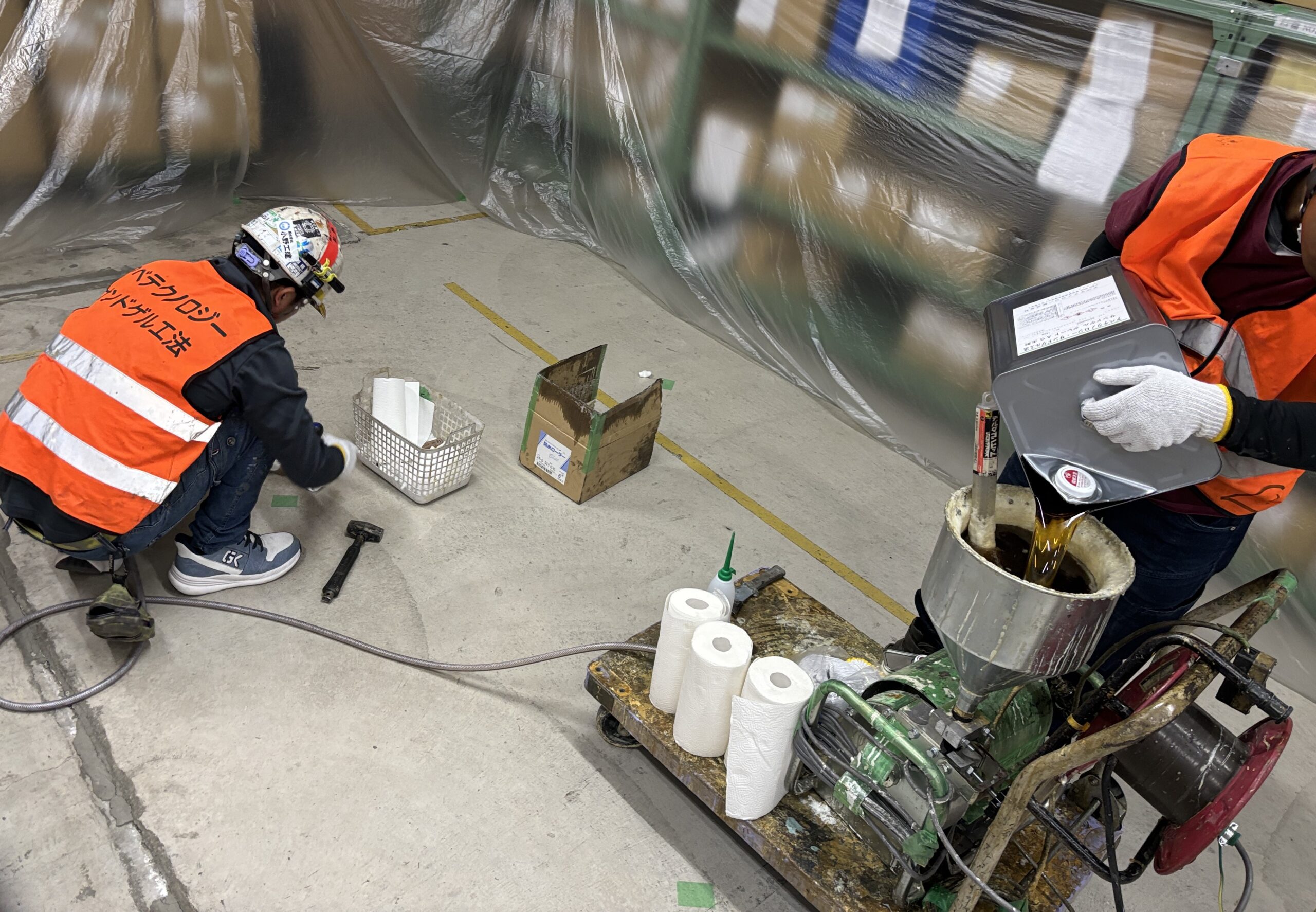 奥に見える注入工からいれた材料が地面をめぐってクラックから吹き出しています。