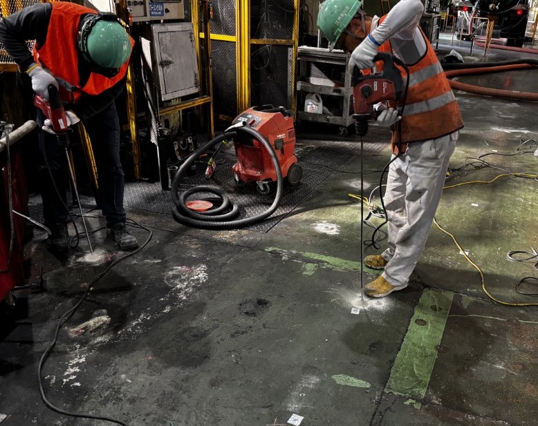 大型設備も多くその周辺の床厚が厚い部分は、長尺のドリルで削孔していきます。