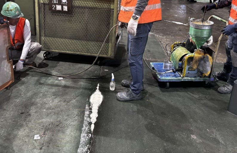 床が厚いエリア、設備周辺で進行した空洞化が確認された注入孔には樹脂を増量し注入していきます。