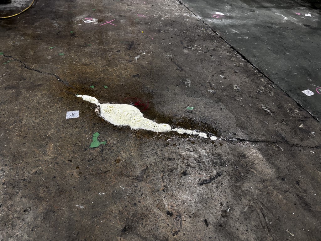 床のひび割れなどから反応した樹脂が浸み出してきました。