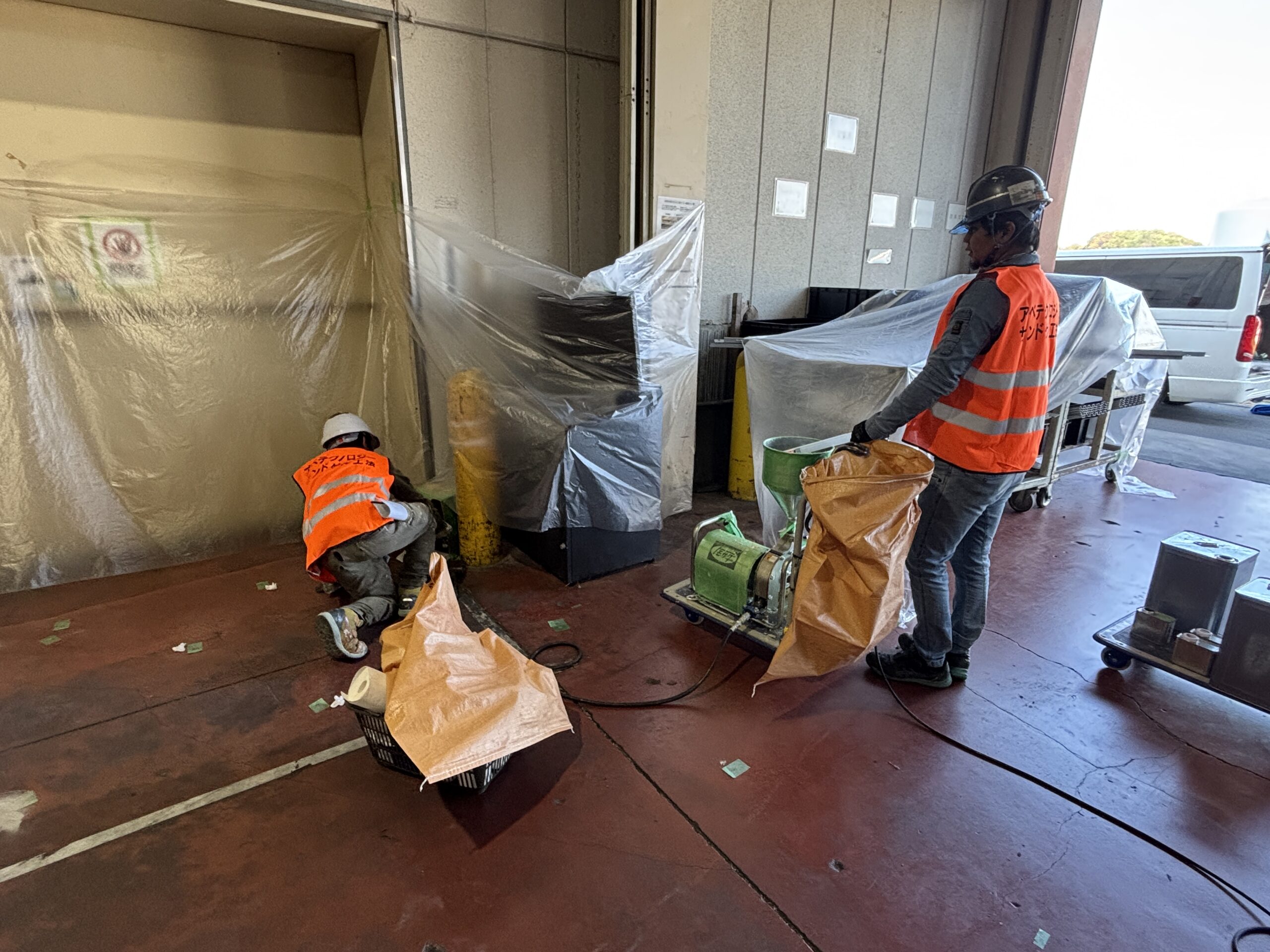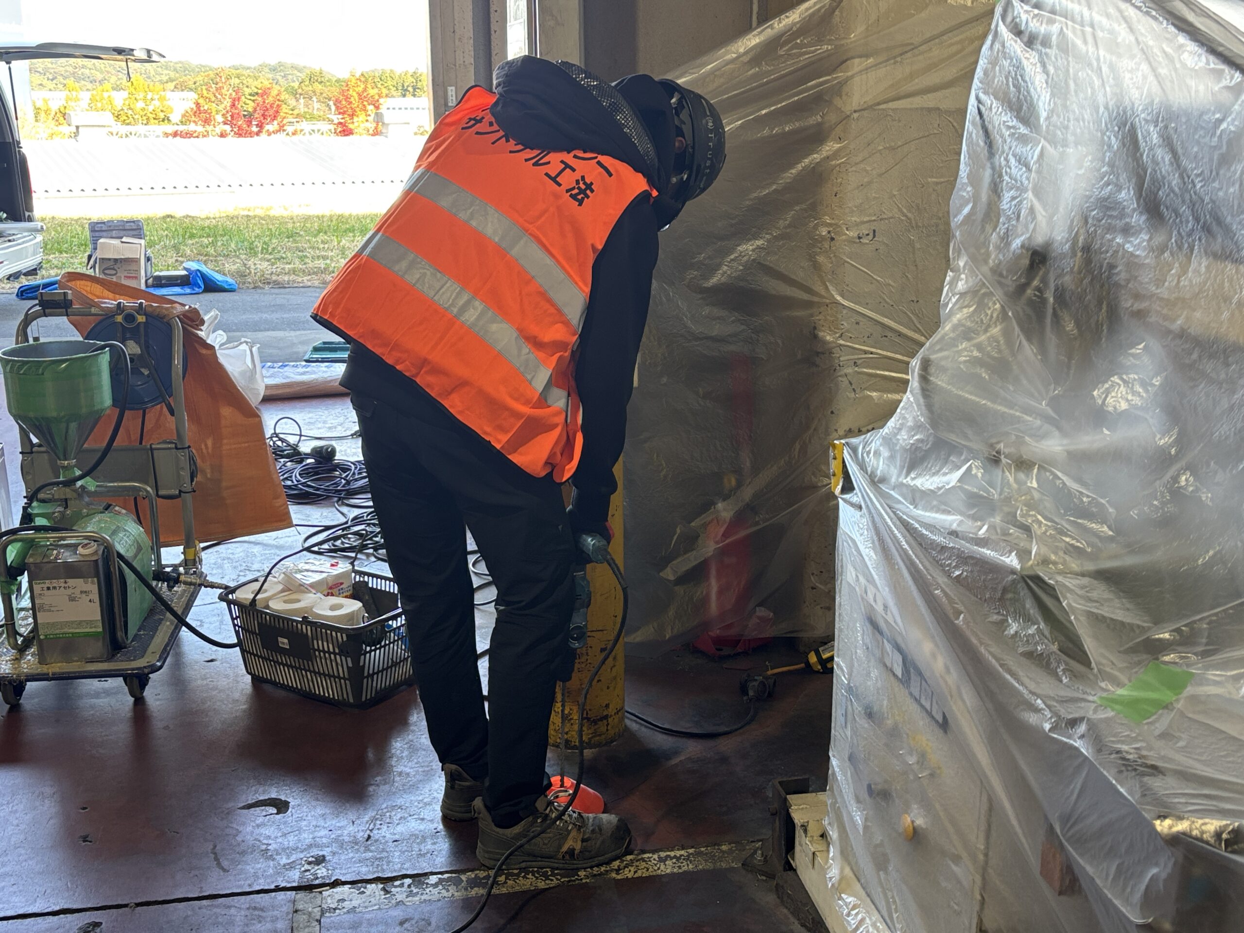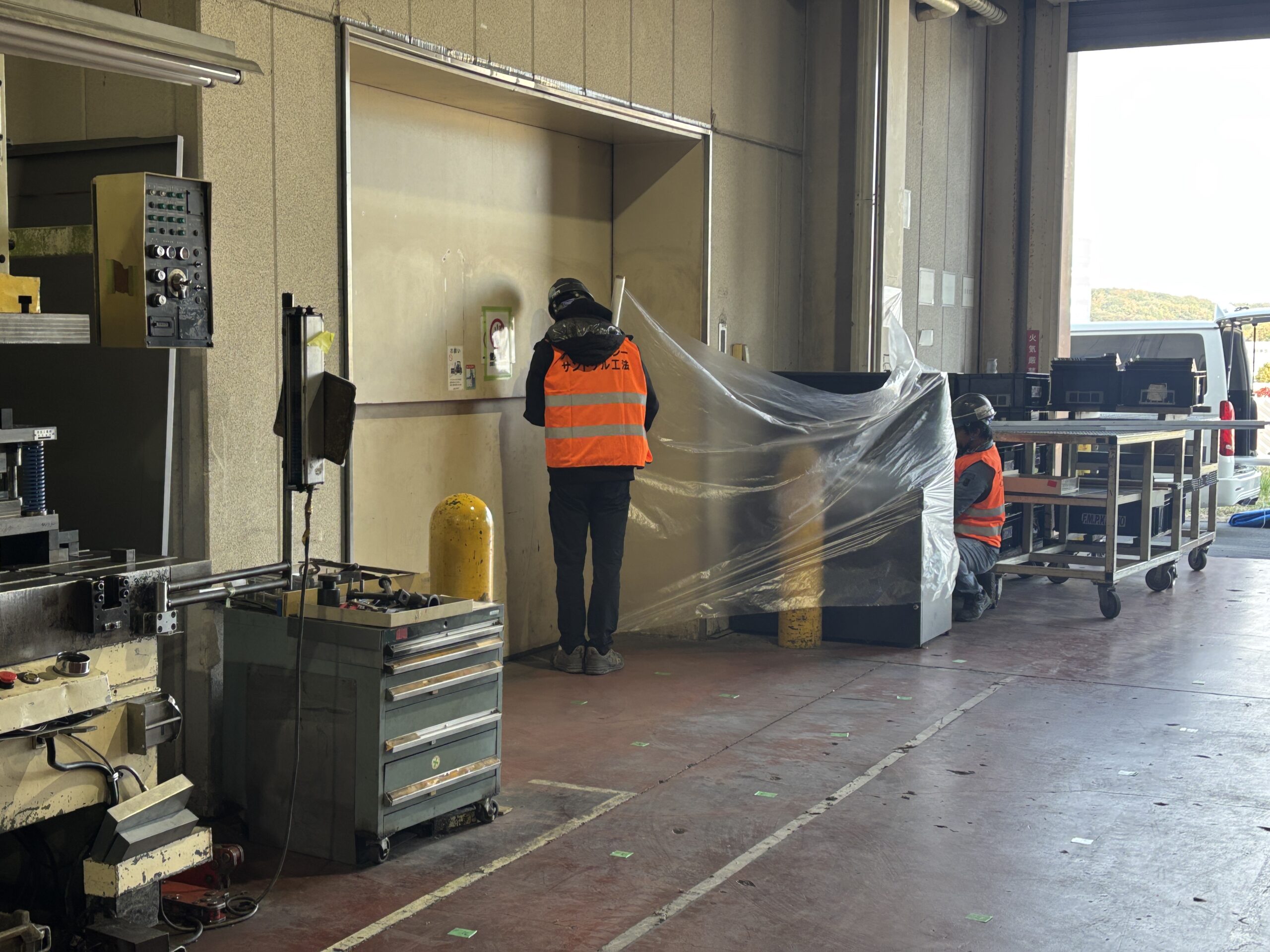 万が一、粉塵などが付着しないようにビニールシートで現場を養生致します。