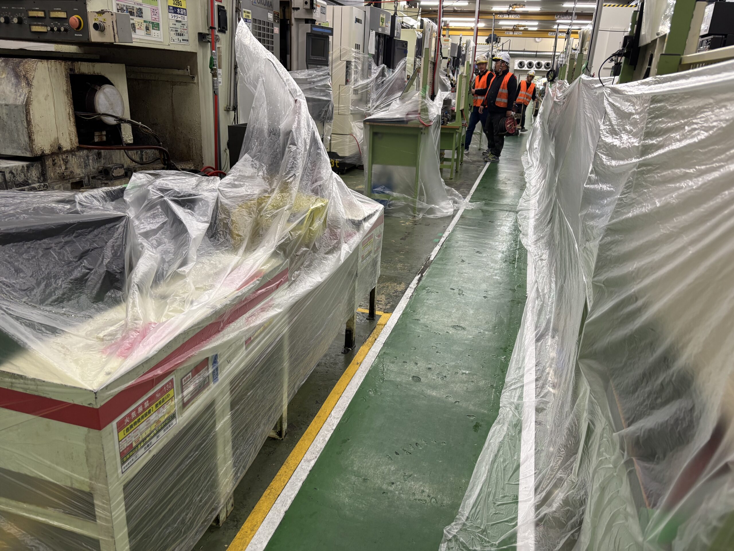 今日の現場は所狭しと機械が並んでいますので、一つ一つに養生をしていきます。