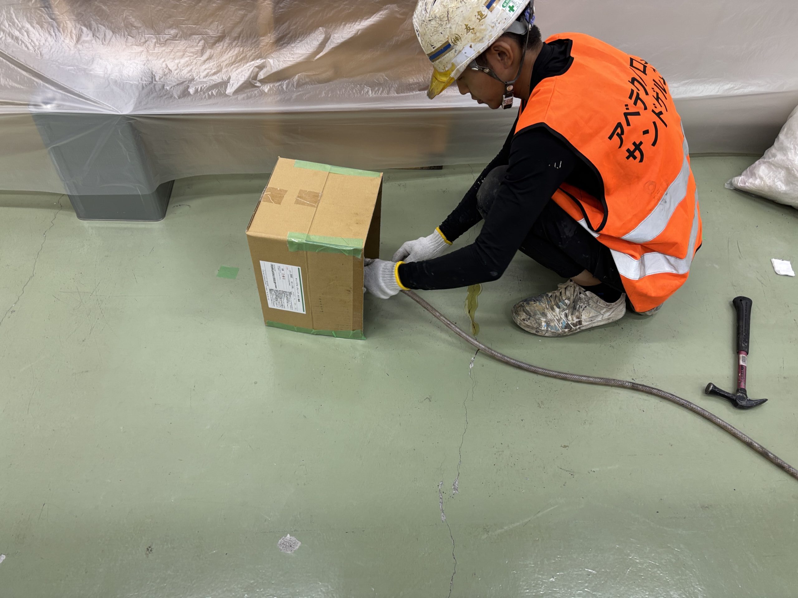 サンドゲル注入時、削孔時の飛び散り防止で養生を行います。