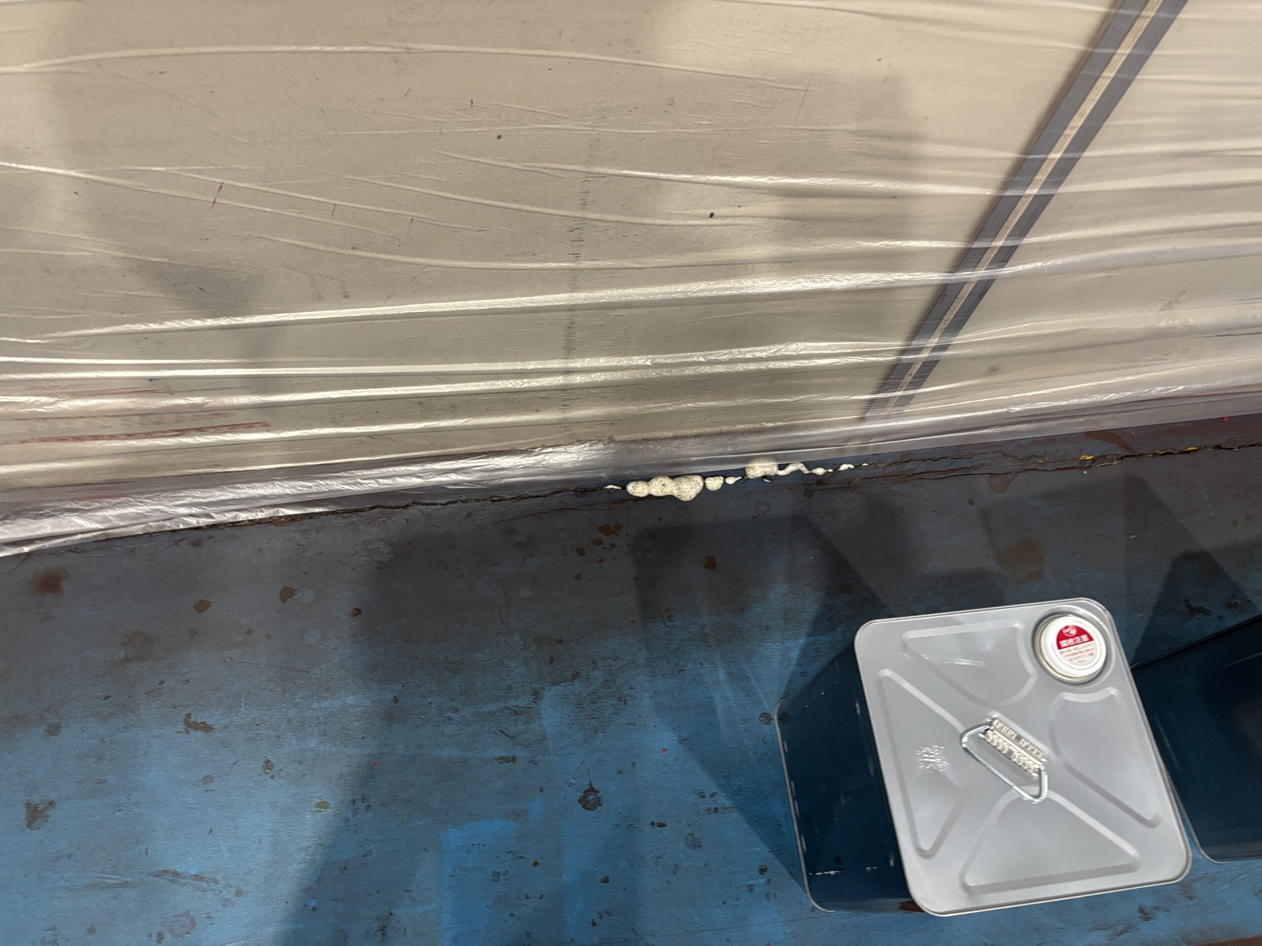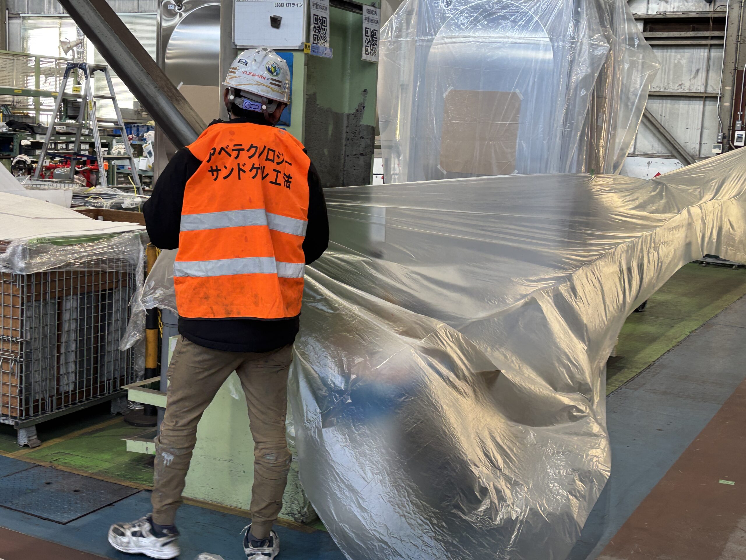 機材・製品のまわりはしっかりとビニールシートで養生します。