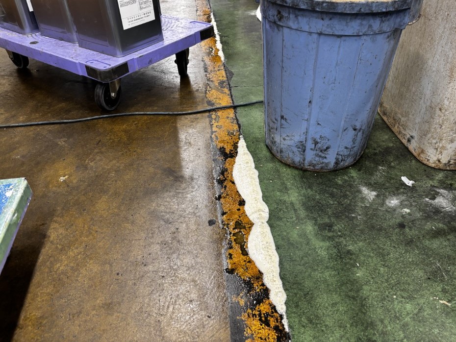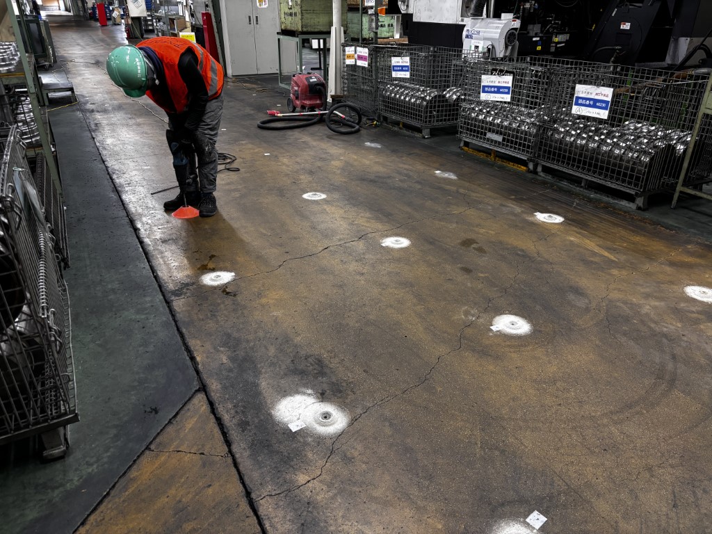 工場床各所にひび割れが発生し、フォークリフト走行時やマシニング稼働時に振動が気になるという事で、床下の実態確認。随所で空洞化が確認され、優先度の高いエリアから安全対策工事を実施。